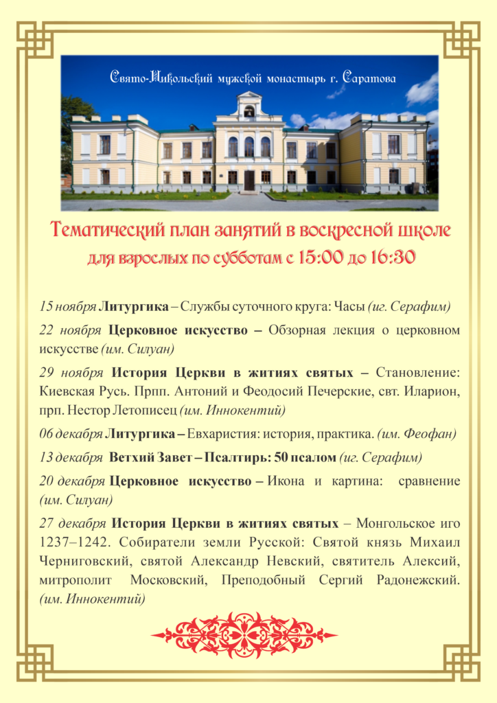 15 ноября, в канун Недели 23-й по Пятидесятнице, дня памяти священномученика Космы Саратовского, наместник монастыря игумен Серафим (Баранов) возглавил Всенощное бдение.